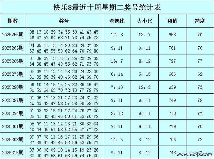 福彩悠闲8第2025315期(上周二)开奖回来:03 06 08 09 10 14 15 19 23 26 38 40 47 58 61 68 69 74 75 80,其中奖号和值为743,跨度为77,奇偶比为9:11,大小比为8:12。